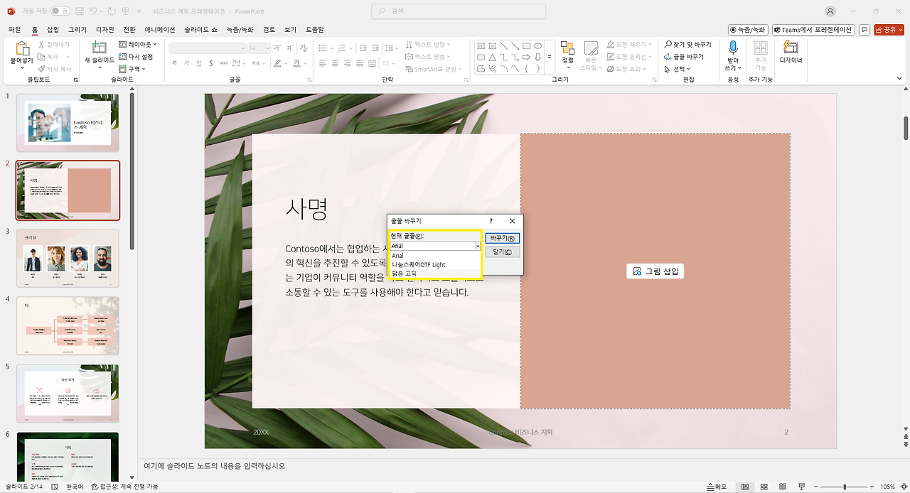 → 디자인 탭에서 팀 지정 글꼴로 기본 적용